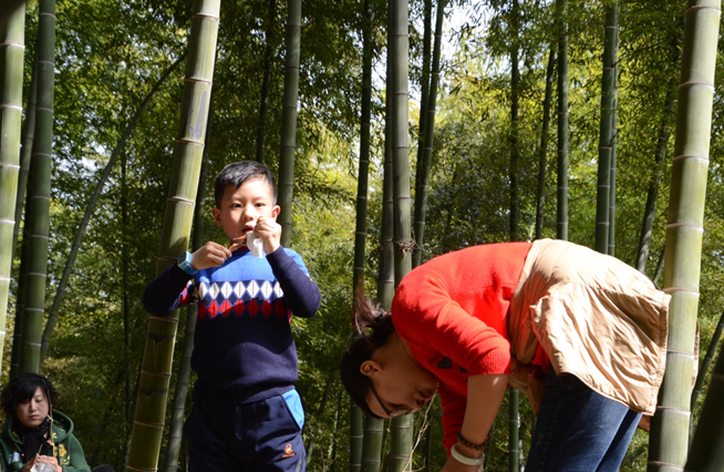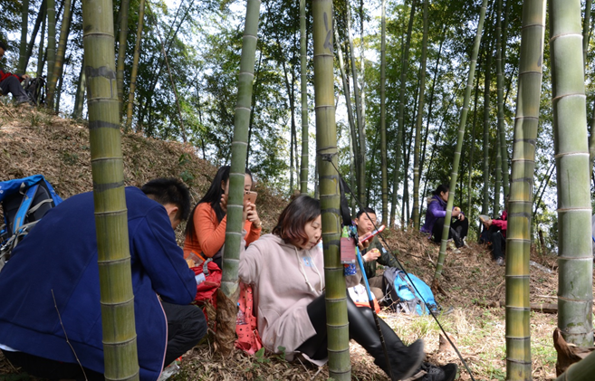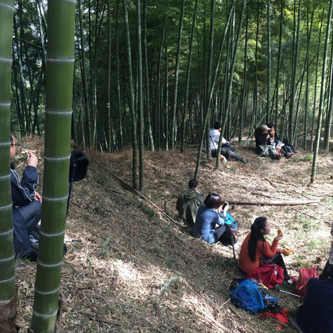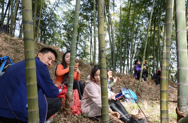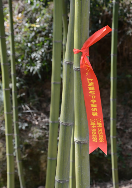徒步三不借“水不借、钱不借、睡袋不借”------哈哈,那我们只能自己背点水呗!所一个背包是每个人所必须的;因为要野行、登高,所以较好的防水徒步鞋也是必不可少,当然建议是配备基本的初级登山杖!不说这些,我们跟随着大队伍行径了约1.5小时已近正午,虽是正午,但密实的竹林让我们很好的避开了太阳的“炙烤”,林中微风抚面还是很惬意的。新驴们在一开始前的兴奋也逐渐缓和,小汗珠脸上也已挂满。由于行路前领队和老驴们的指导,新驴们对这段上坡的路程,气息和步法还是控制的不错的。
